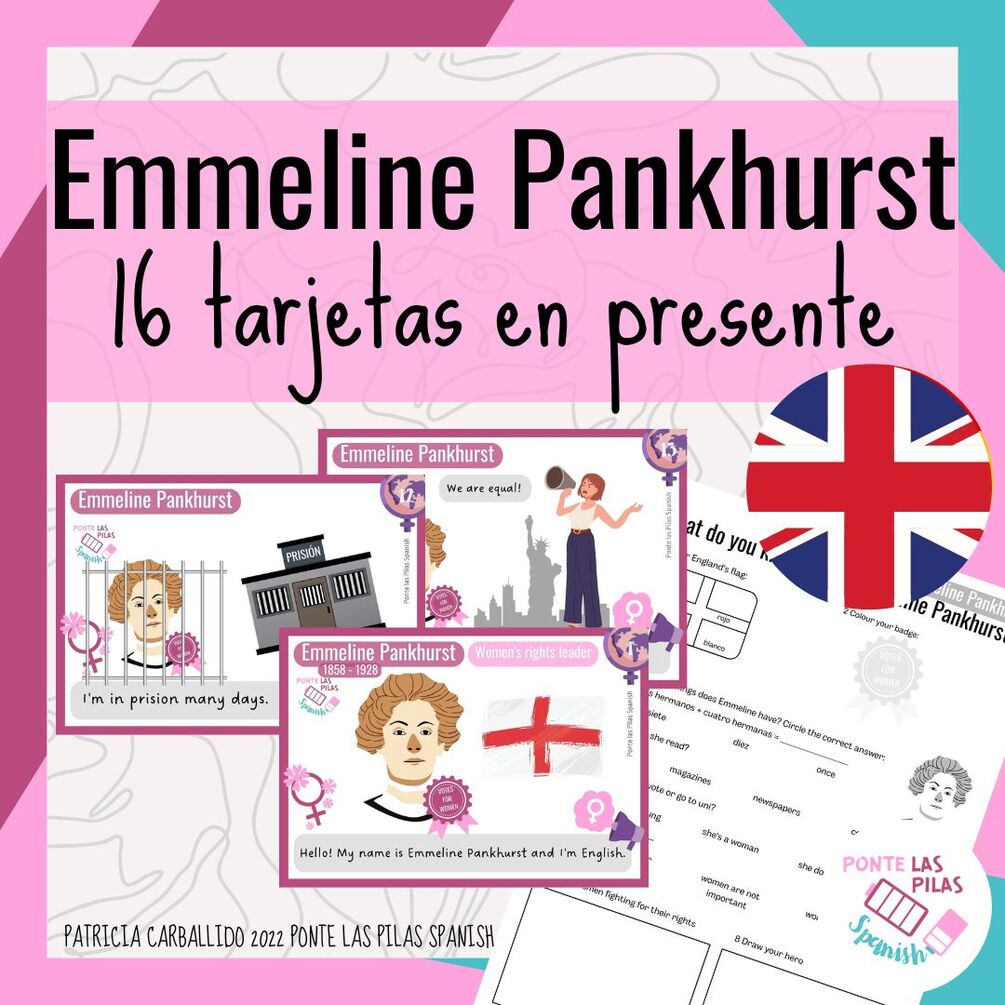 Aprendemos la vida de Emmeline Pankhurst con tarjetas coloridas y español básico. Todas las frases tienen vocabulario fácil y están en el presente.